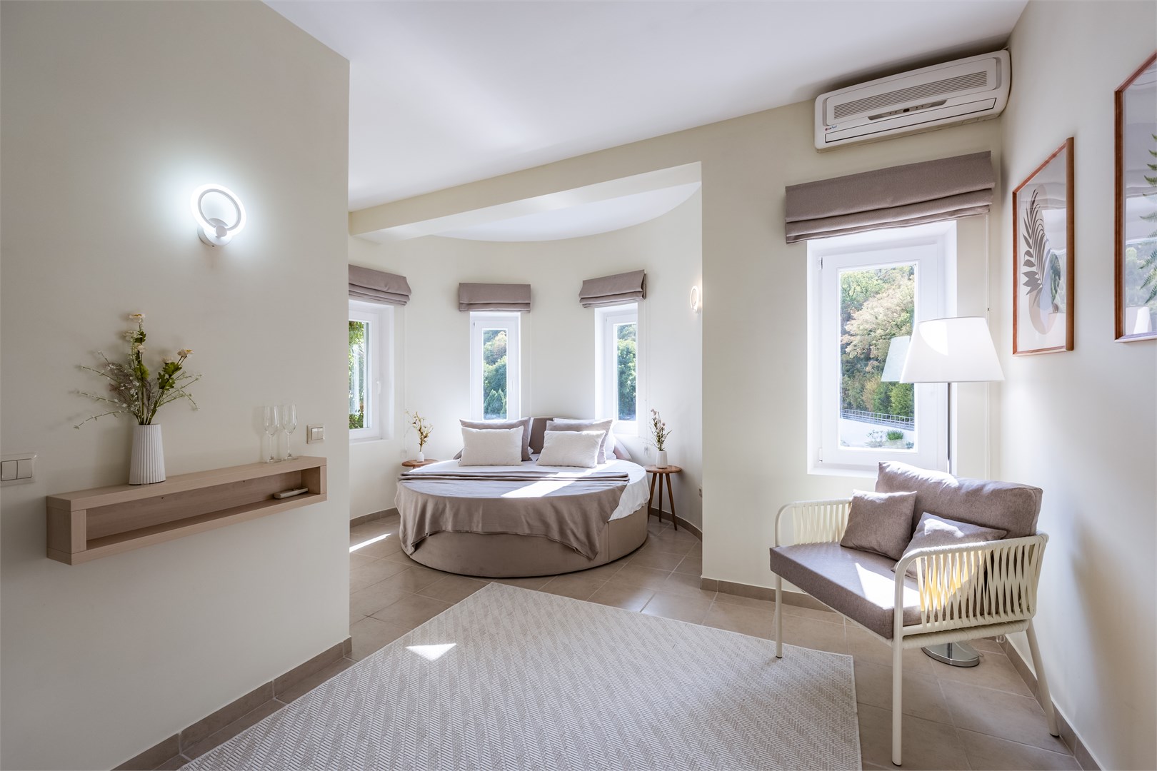 В центре комнаты расположена удобная двуспальная кровать, а продуманная планировка создаёт ощущение уюта и спокойствия.