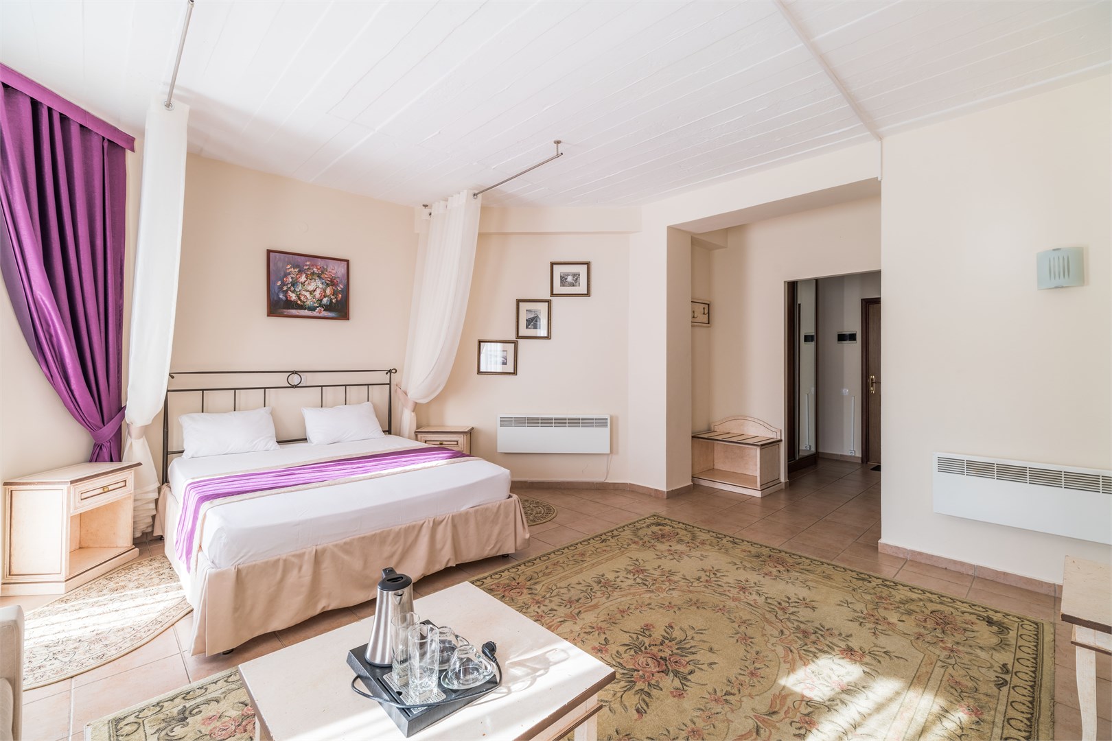 Центральным акцентом интерьера становится двуспальная кровать с изящным балдахином, задающая атмосферу уюта и приватности.