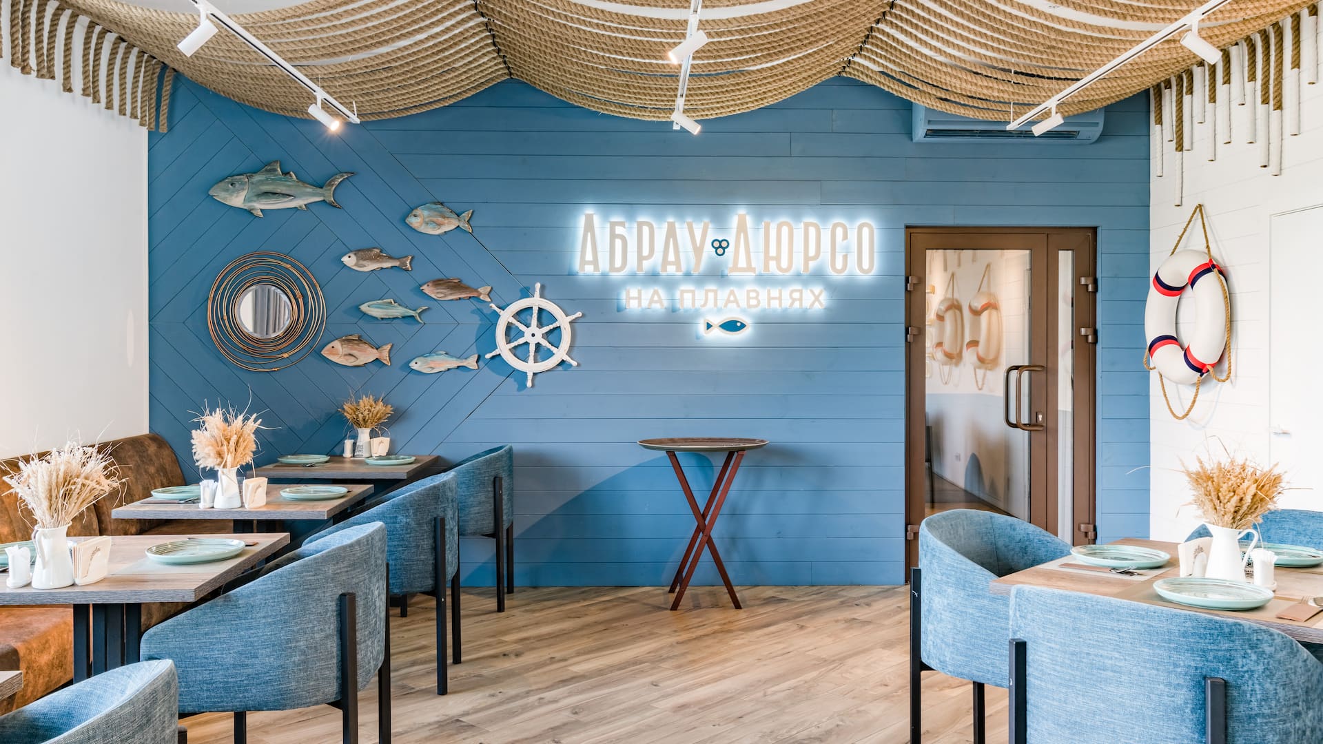 Интерьер ресторана выполнен в морском стиле и создаёт ощущение, будто вы оказались в уютном скандинавском рыбацком домике. Светлые тона, натуральные материалы, элементы, вдохновлённые морской тематикой, — всё работает на создание атмосферы уюта, спокойствия и гармонии с природой.