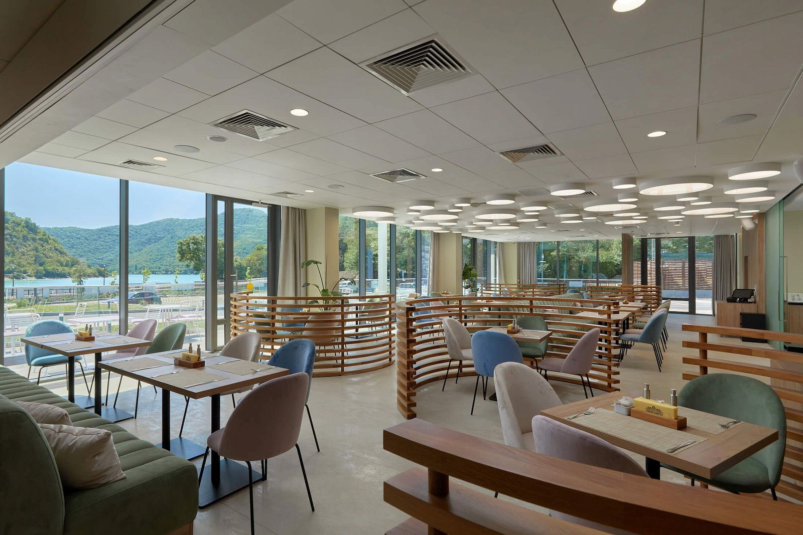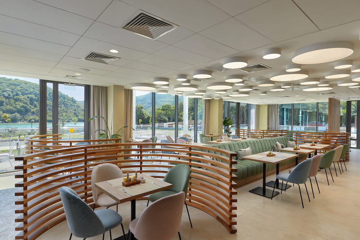Панорамные окна ресторана открывается вид на озеро Абрау и окружающие его холмы, создавая ощущение спокойствия и уединения в любое время дня. Видовая терраса позволяет наслаждаться завтраками, обедами и вечерними встречами на свежем воздухе, в самом сердце курорта.