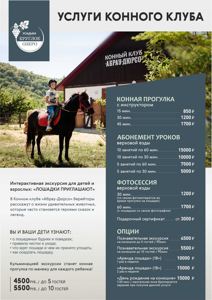 «В Конном клубе «Абрау-Дюрсо» вашу безопасность и комфорт обеспечат опытные и профессиональные берейторы высокого класса, преданные своему делу. Наши специалисты обладают не только глубокими знаниями о лошадях, но и умеют найти индивидуальный подход к каждому гостю. Доверьтесь надежным и квалифицированным берейторам «Центра туризма Абрау-Дюрсо», и ваше знакомство с миром конного спорта станет незабываемым и безопасным!»