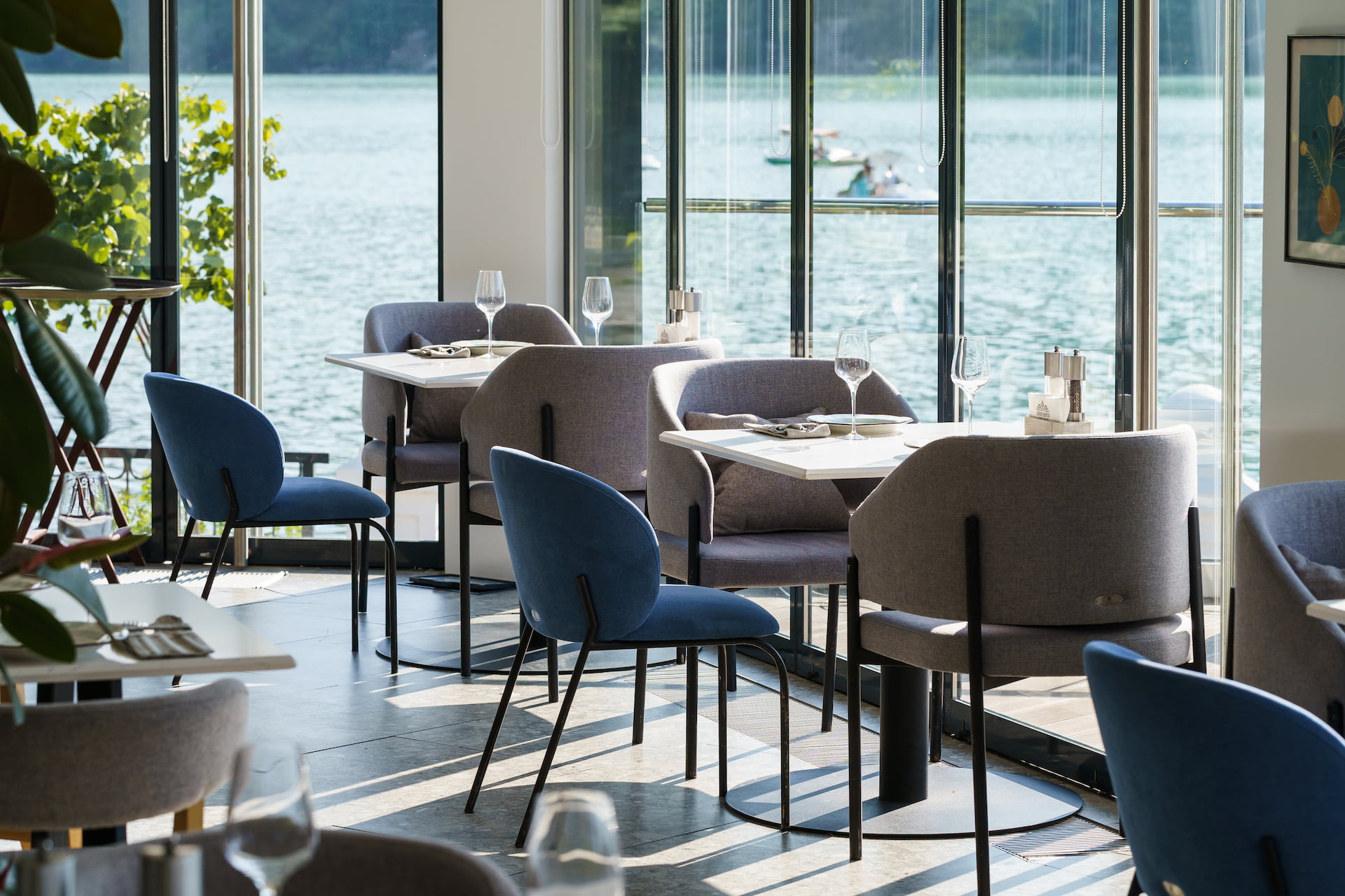 В интерьере читается вдохновение Черноморским побережьем. Зелень растений и бирюзовые акценты напоминают о лазури волн. Над барной стойкой парит композиция из бокалов, а кольцевые светильники отсылают к пузырькам игристого.
