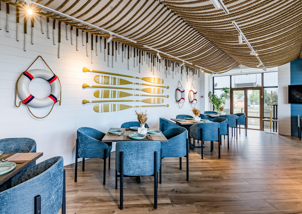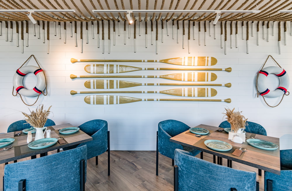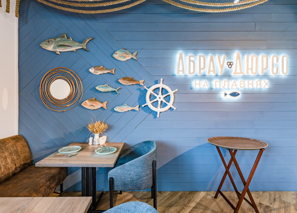 Интерьер ресторана выполнен в морском стиле и создаёт ощущение, будто вы оказались в уютном скандинавском рыбацком домике. Светлые тона, натуральные материалы, элементы, вдохновлённые морской тематикой, — всё работает на создание атмосферы уюта, спокойствия и гармонии с природой.