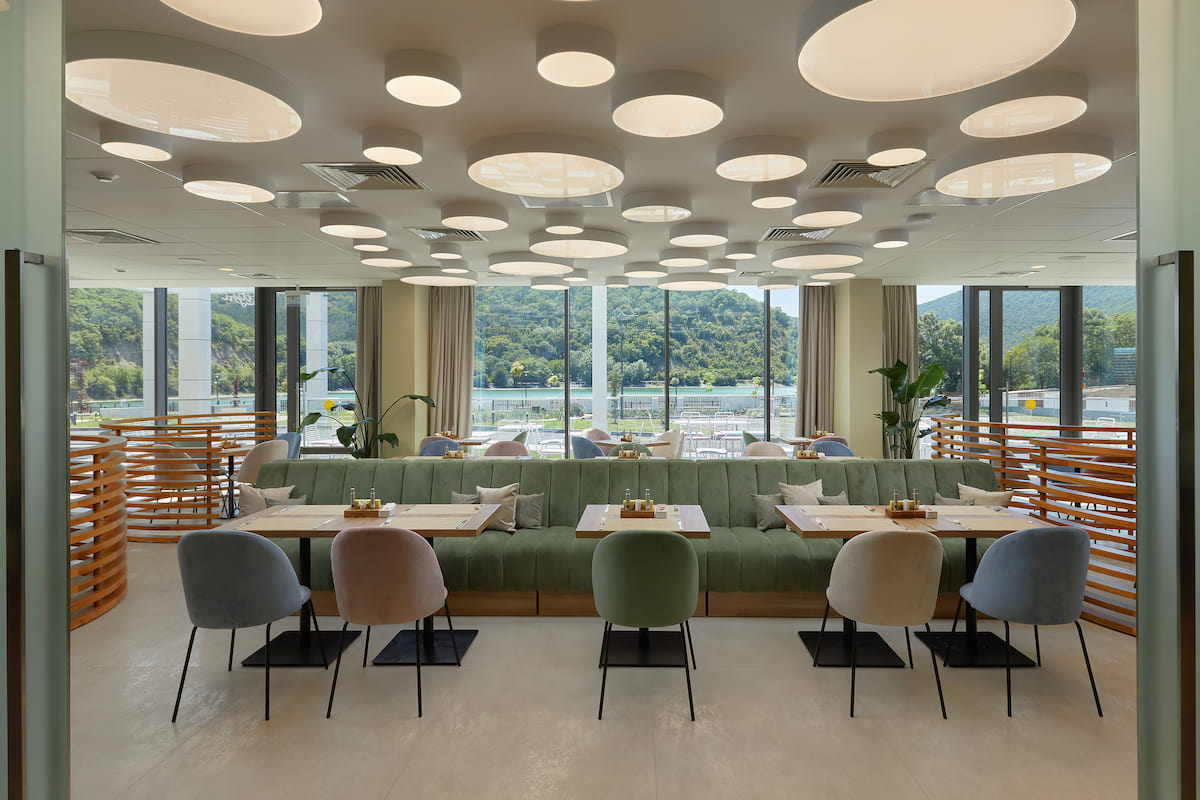 Панорамные окна ресторана открывается вид на озеро Абрау и окружающие его холмы, создавая ощущение спокойствия и уединения в любое время дня. Видовая терраса позволяет наслаждаться завтраками, обедами и вечерними встречами на свежем воздухе, в самом сердце курорта.